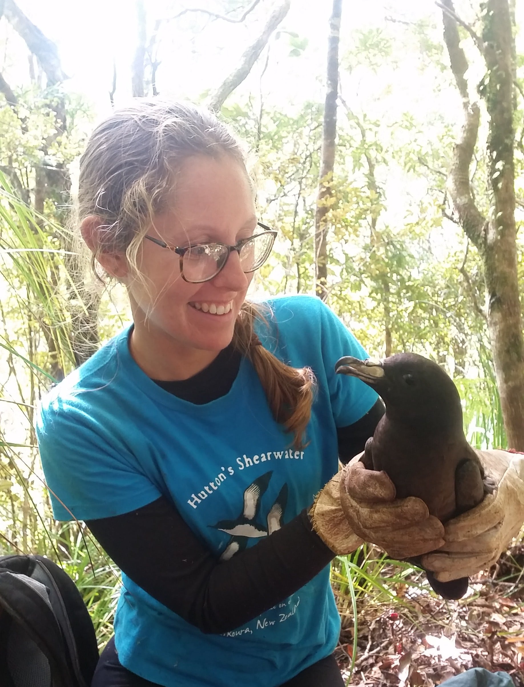 Dan and I quickly found our first burrow and, after donning thick leather gloves (because these birds are at the top of the food chain and their beaks can do some damage), I eagerly stuck my hand down to meet my first black petrel. It’s huge eyes greeted me as I led it out by its beak. It was a banded bird! The band number was read and the bird weighed. We checked the burrow before putting the bird back and found a large milky-white egg.