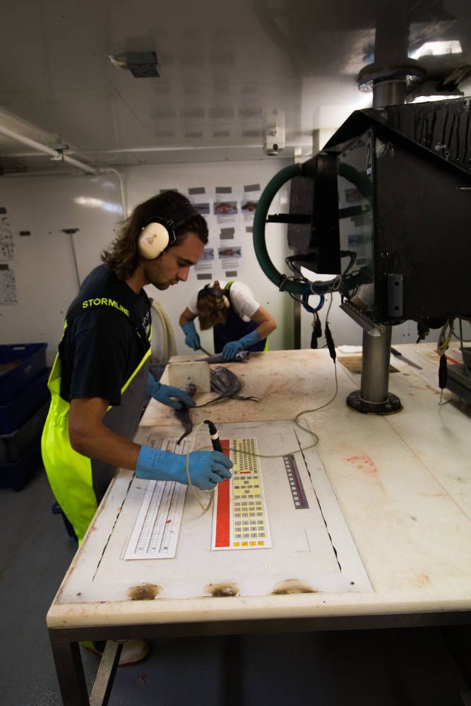We are now a week into the trip and starting to get quite familiar with life on-board and the work! Our shifts are spent below deck in the wet lab sorting the catch and entering biological data for each species of fish, sharks, invertebrates and everything we catch. It’s fascinating seeing the difference between shallow water and deep sea catches, how much the diversity changes and the abundance of species drops or explodes.