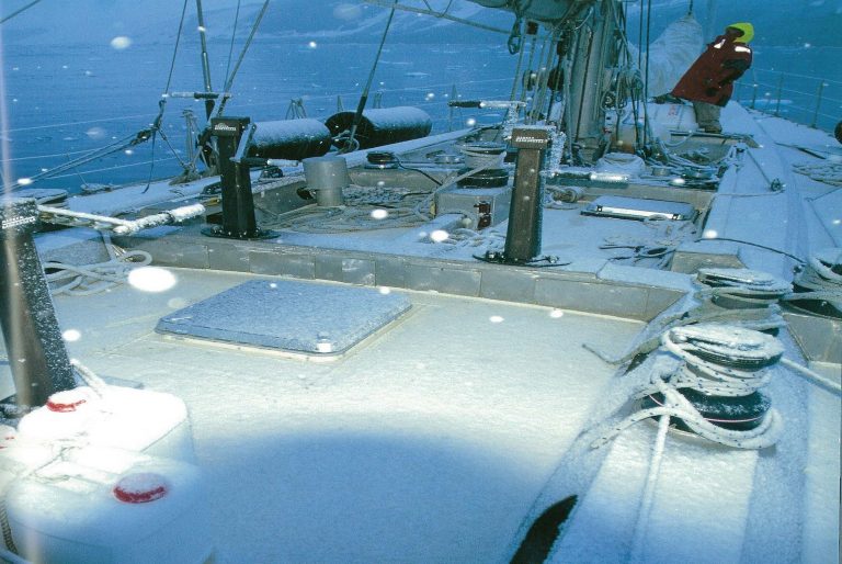 The wind rose as the evening progressed until it was 35 to 40 knots from the east – driving fine sleet before it that covered everything. Gradually the decks became sheets of ice, the sea water froze on the life lines as it left the now-steep waves as heavy spray, and forward visibility reduced to less than 100 metres or so.